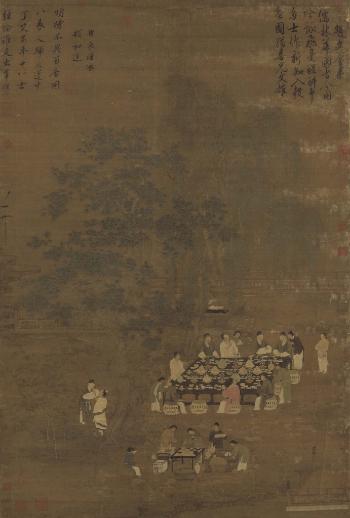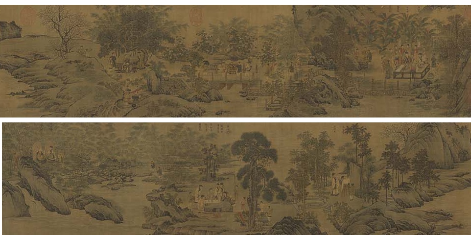 雅集的真實性不重要,後世的影響才是關鍵。若郭熙(約1023-1087後)能提出「真山水」的抽象集合概念(註1),這些文人舉辦一場「理想雅集」有何突兀?所有研究都指出,這場雅集就是以蘇軾為核心,參加的16人中更有8位為元祐黨人。已有學者將南宋初的西園雅集浪潮,視為元祐精神的復興(註2)。至於令藝術史家興致高昂的西園雅集圖,如李公麟〈山莊圖〉(圖10),不妨想成一張採用了繪畫傳統中常見的異時同圖手法,所繪製出懷念美好時光的大合照。