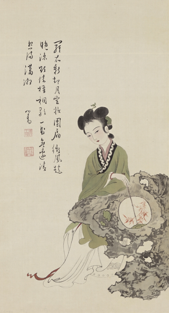 另一種常出現複本是仕女畫作。溥心畬的仕女畫(圖11、12),具有清逸高雅的傳統氣質,屬於明清仕女清麗的樣式。相同筆法繪製的〈觀音〉畫像,線條淡雅、衣褶飄逸,具有莊嚴靜美之貌。諸多觀音畫像是為紀念他的母親項夫人,每逢母親忌日,往往割指沾血,恭寫〈心經〉,或以血滲硃砂繪觀音。史博館〈硃砂觀音〉(圖13)與故宮的〈研朱觀音〉(圖14)兩件作品構圖、款識、日期都完全相同,僅史博館本圖上比故宮本少了兩枚印。此外像〈水月觀音〉、〈達摩〉、〈駱駝與人〉等作品,都具有複本,同一構圖都以白描作畫,有的敷彩稍有不同,有的大部分相似,但身著衣服是不同顏色、抑或在岩石上多幾棵枝葉等小變化,而題以不同的詩句。此外亦有些花鳥作品,如故宮〈楓竹幽鳥〉與〈秋高鳴鵙〉,兩作為同一構圖,以落款內容有所差別區隔。