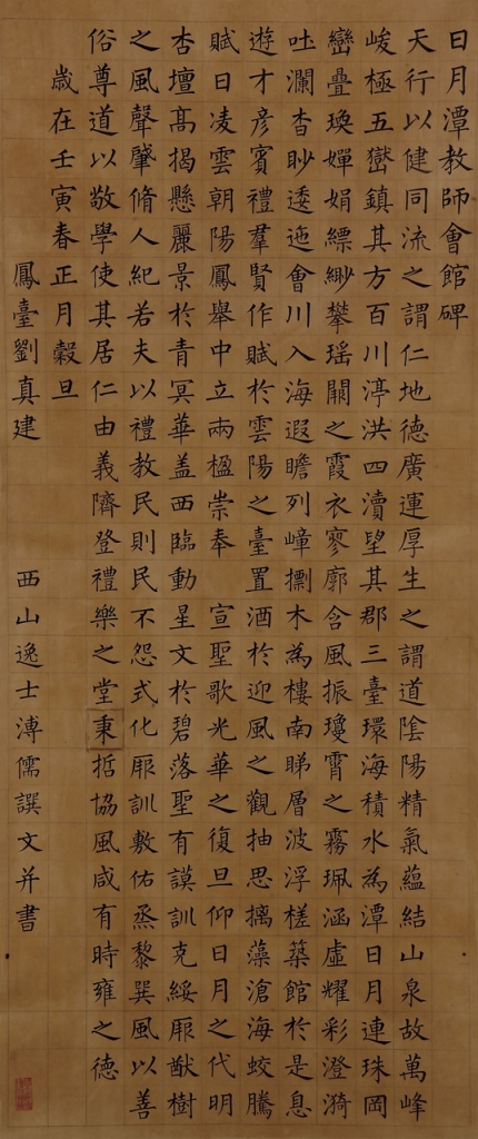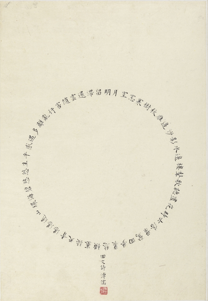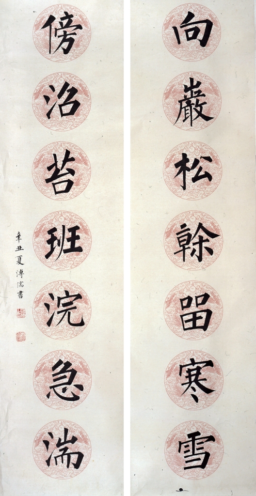 溥心畬年輕著力極深的正楷,在〈日月潭教師會館碑〉(圖4)一作中展現無遺。原件長168.2公分,寬55.5公分,整體架構端莊,用筆嚴謹,勾畫勻整,一絲不苟。以此作為中小學書法範本,允為正楷典則。而正楷對聯,善於用腕,筆鋒穩健,如〈楷書對聯〉(圖5)結體稍有歐柳遺意,用筆於嚴整中見出從容不迫的風度。另多件小楷,輕妙秀麗,用筆雅致,有館閣雍容之態,,且多自作之文,而相得益彰。其中以〈圈型迴文詩楷書字幅〉(圖6)更顯精妙,字體優美,詩句尚可以任意順讀或逆讀,用辭遣字典雅適當,可見文氣深藏。王壯為曾評其書法云:「我以為當代書家,論楷法的謹嚴精妙,應當以他為第一。」實為的論。