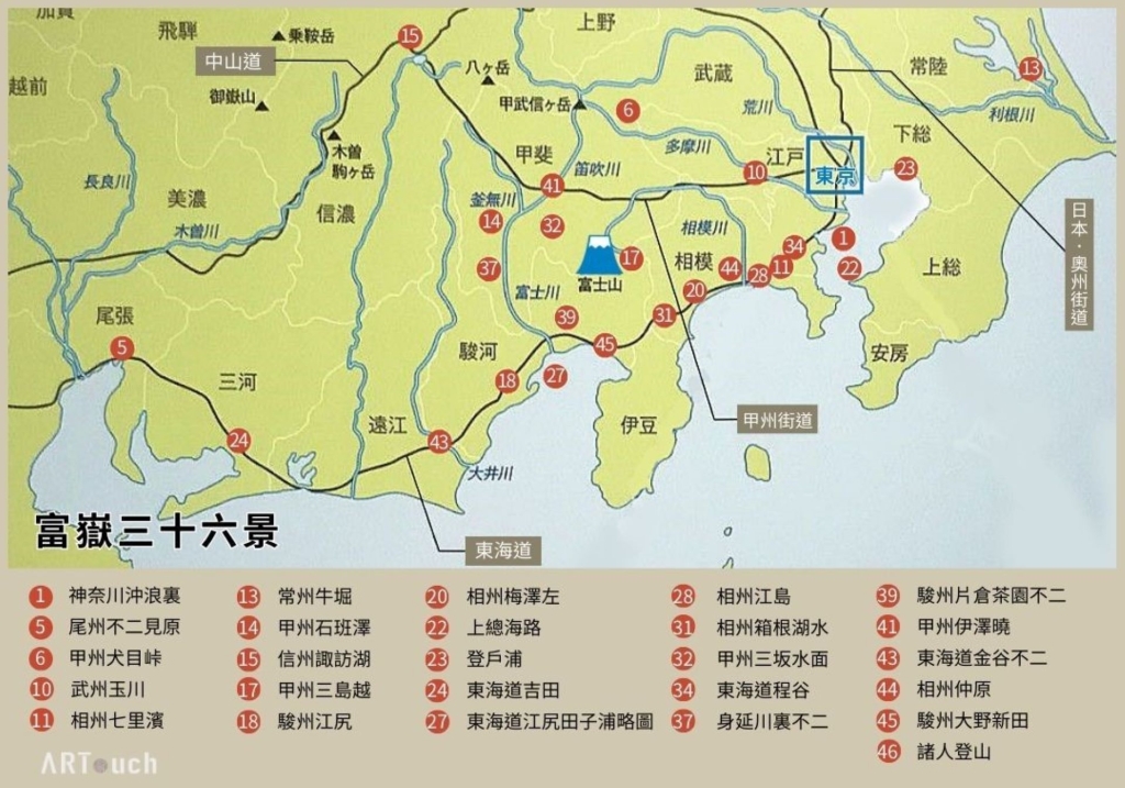《富嶽三十六景》初版共36幅,大多從東面與南面,也就是江戶(今東京)方向眺望富士山。系列因廣受歡迎,後來又增補10幅,轉向北面與西面等較少見的視角描繪富士山。這些來自北與西側,也就是「裏富士」(富士山背面)的風景,被稱為「逆景」(ぎゃっけい)。全系列最終共繪製46幅【全圖】。 下方地圖標示了其中43幅作品的取景位置,其中有17幅描繪自江戶地區,另附局部放大圖呈現具體地點。