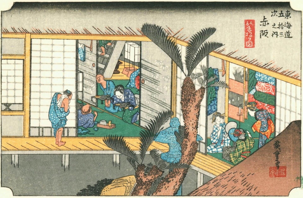 廣重也不避諱描繪旅宿中的趣味風情,〈御油:旅人留女〉描繪黃昏時分的五友旅館前,「留女」們——專職招攬客人的女性——正攀談、拉扯旅人留宿,場面熱鬧而寫實。前排男子的風呂敷被扯變形,神情痛苦卻滑稽;另一人衣袖被拉,顯得手足無措。畫面右側的旅館內,一名旅人脫下草鞋準備入宿,老婦人則端出洗腳盆迎接,細膩刻畫出庶民旅宿中的人情味與生活感。
