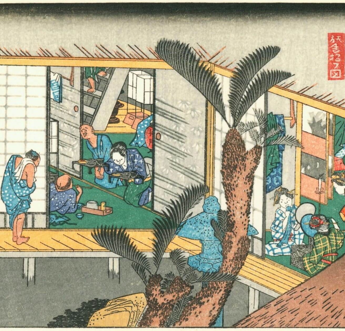 移動之外,住宿是旅行中另一項重要日常。依階級與財力不同,旅宿選擇也大不相同。大名與官員夜宿「本陣」或「脇本陣」,由隨從與人夫服侍;庶民百姓則選擇價格實惠、提供簡便餐飲與娛樂服務的「飯盛旅籠」,或更為簡陋的「木賃宿」。