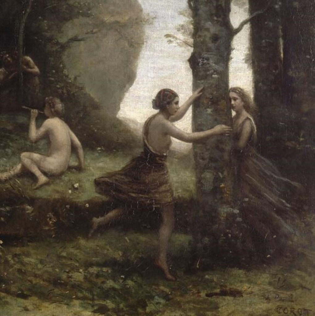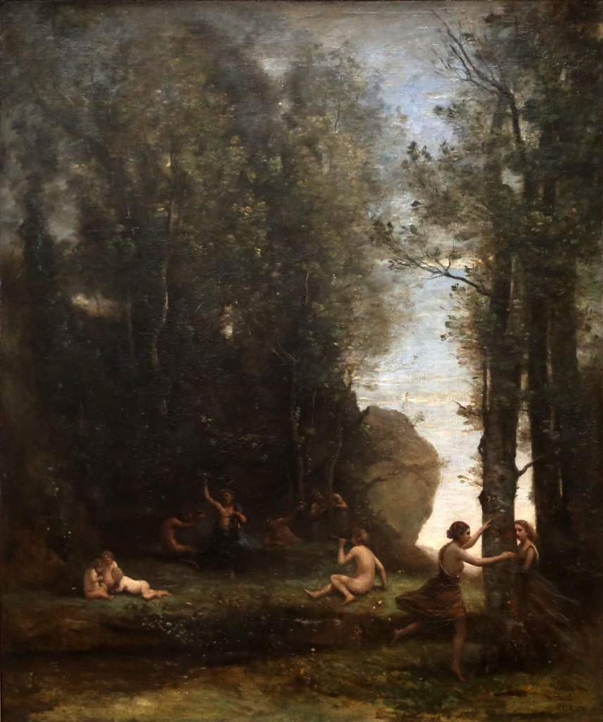 活躍於19世紀的巴比松畫派代表畫家──尚-巴蒂斯特・卡密爾・柯洛(Jean-Baptiste-Camille Corot, 1796–1875),以其抒情而富詩意的風景畫聞名於世。他的風景畫往往營造出一種靜謐和諧的氛圍,畫中人物多以舞蹈、演奏樂器,或安坐於草地的姿態出現,呈現出悠閒自在、遠離塵囂的生活樣態。這些人與自然和諧共處的景象,為整體畫面增添閒適愜意的氛圍,使觀者彷彿得以進入一處遠離世俗紛擾的世外桃源。
