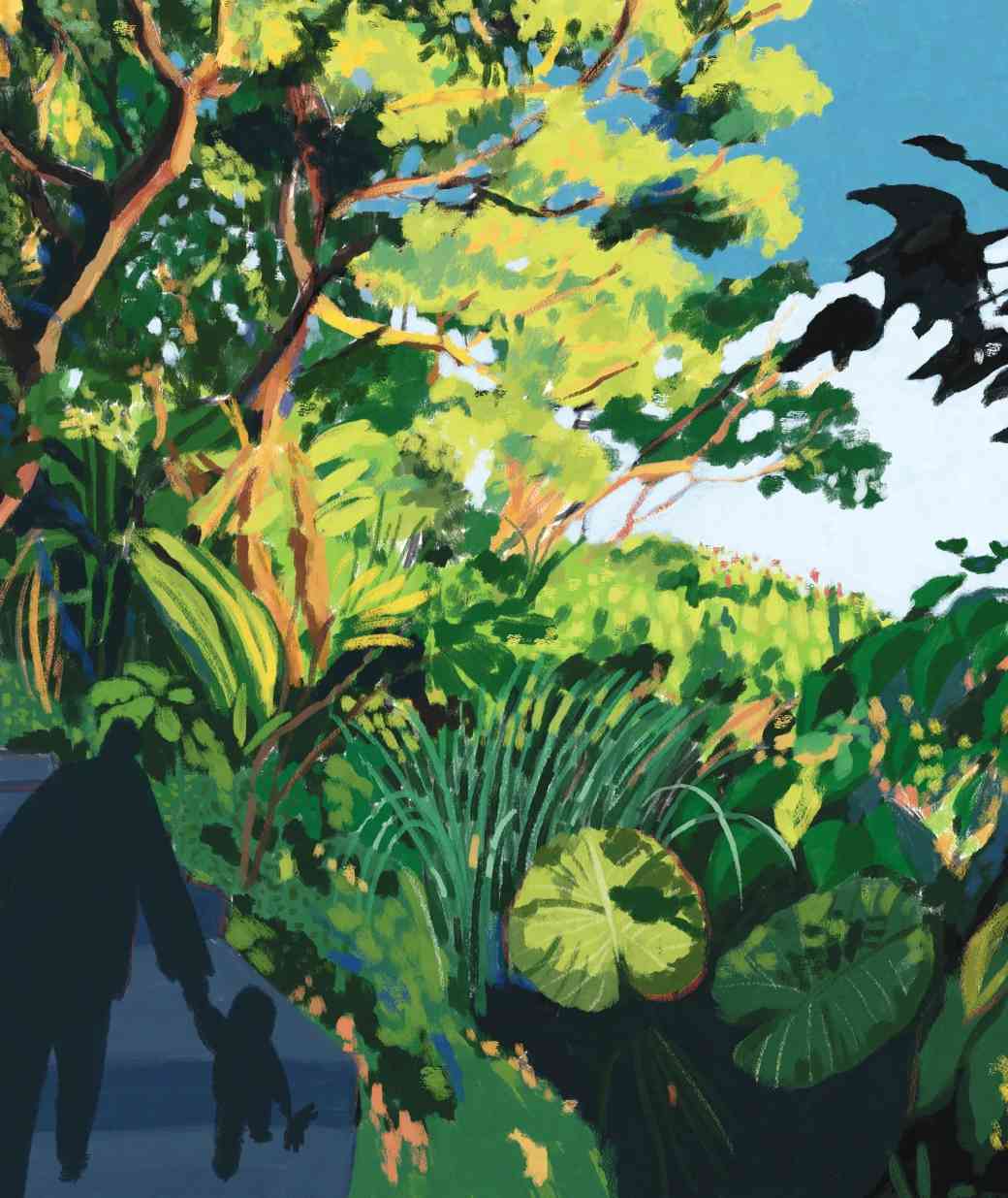 Hsin-Yi Yao目前定居在英國,每次回台灣時,總想把握時間好好看看台灣,把台灣的美好展現在畫布上,就像這次為《點讀華山》所繪製的封面「山中漫步」,其靈感來自於某次在台灣爬山時,她彎入一條人煙稀少的小徑,走著走著忽然間被眼前迷人的綠樹與光影所吸引,所以在畫圖時,她使用堆疊與保留筆刷的筆觸效果,展現出大自然動人的一面,另一方面也刻意採用全然不同的筆觸來繪製人物剪影,讓彼此相互襯托。此外,不畫出人物的細節,也提供一個讓觀看者自行將情感投射其中的可能。