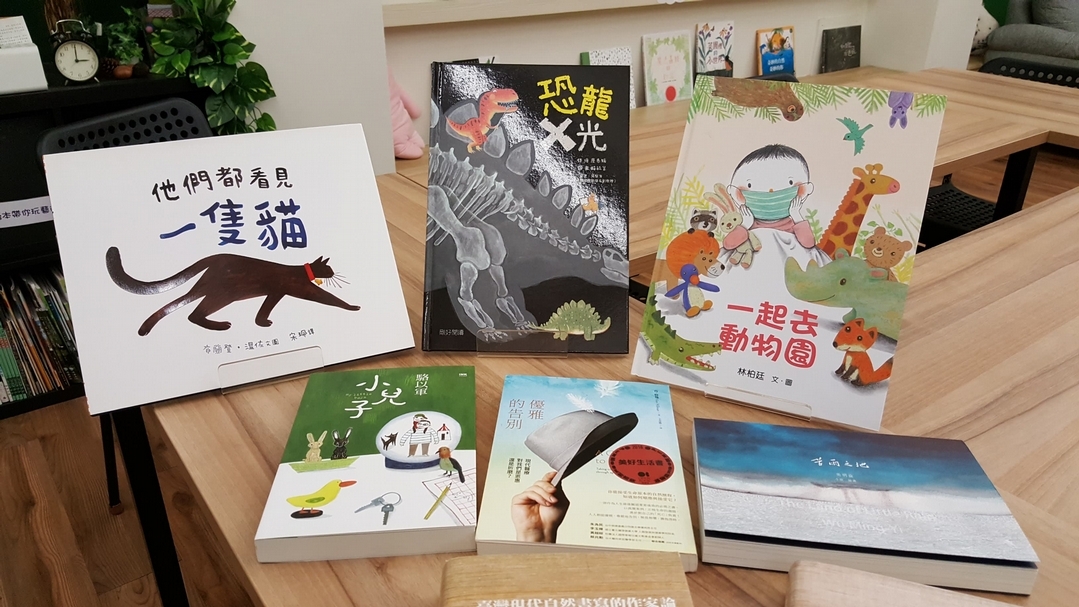 叮咚!書箱送達,拆封、檢查,常常,書還在桌上堆著,管家就禁不住某本書的呼喚,一翻動書頁,忙碌的聲息便默默退場了。由右上至左下,依序為《一起去動物園》、《恐龍X光》、《他們都看見一隻貓》、《苦雨之地》、《優雅的告別》以及《小兒子》等書籍。