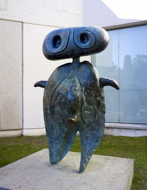 往前走至玻璃大門等待進館,有位大人物敞開雙臂迎接我們呢。他睜得大大的雙眼彷彿在告訴我們「待會進去的時候也要張大眼睛仔細看每一件作品喔!」這位名叫〈Personage〉的朋友,是米羅以銅為媒材雕塑而成,圓渾平滑的線條讓他呈現滿滿的親切;與他對視的那一刻起,這位似乎來自未知星球的孩子,正用眼裡的單純提醒我們:拋開外在現實的紊亂,與米羅一起直指內心吧!