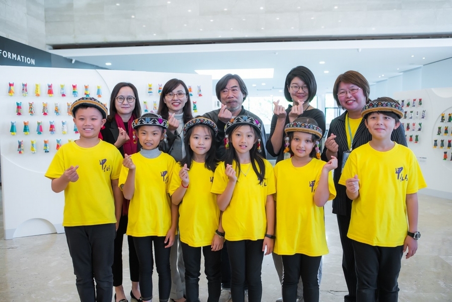 現場貴賓合影(後排左起:學學文化創意基金會執行長駱佳鴻女士、高雄市教育局黃盟惠副局長、藝術家莊普老師、高雄市立美術館林羿妏行政長、高雄市甲仙國小陳姚如校長,前排:甲仙國小學生)