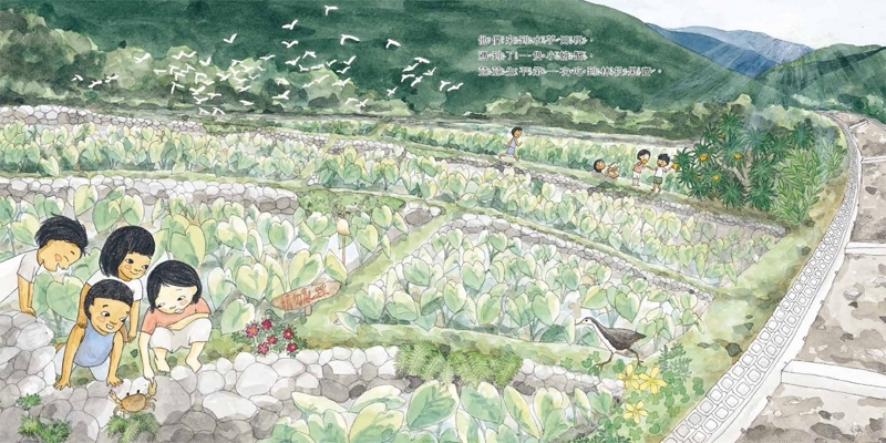 到了蘭嶼,跟當地的小朋友做朋友,一起認識飛魚乾、四處探索,也親近蘭嶼島上水芋田和生態。書中呈現成人旅客,大吃大喝,騎車呼嘯街道,亂丟瓶罐的亂象。然而,相較於成人的匆忙、講求方便速成,孩子們真誠的友誼交流,更顯得彌足珍貴。