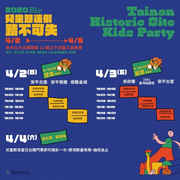 主場臺南的職棒統一獅吉祥物「萊恩」,也將擔任古蹟一日大使,為古蹟區注入活潑熱鬧的氛圍!赤崁樓、安平古堡、安平樹屋、億載金城及1661臺灣船園區等5大園區,於4月2至5日連假4天期間,12歲以下兒童憑證件得免費入場參觀, 4月2、3日並邀請臺南市觀光大使-統一獅吉祥物「萊恩」連兩天在5大古蹟景點與民眾見面互動玩遊戲,定點擔任一日驗票員,歡迎喜歡棒球及支持萊恩的球迷朋友們,一起相約在兒童節連續假期同樂!