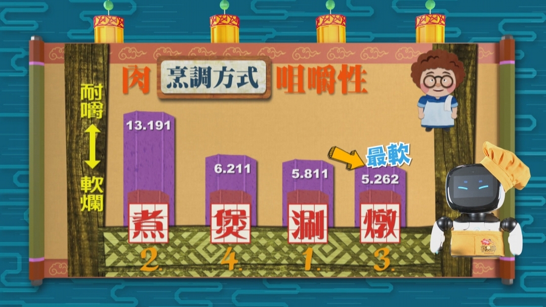 再來,這四種料理方式對於湯中的食材在口感上又有什麼不同影響呢?比較牛肋條的咀嚼性,是煮>煲>涮>燉,也就是說燉的肉最軟爛,其實肉煮得越久,它的組織跟結構就會越鬆散,所以燉湯很適合給老人家跟病人喝,就是讓他們可以不只喝湯,肉也好咬,吸收整體營養。