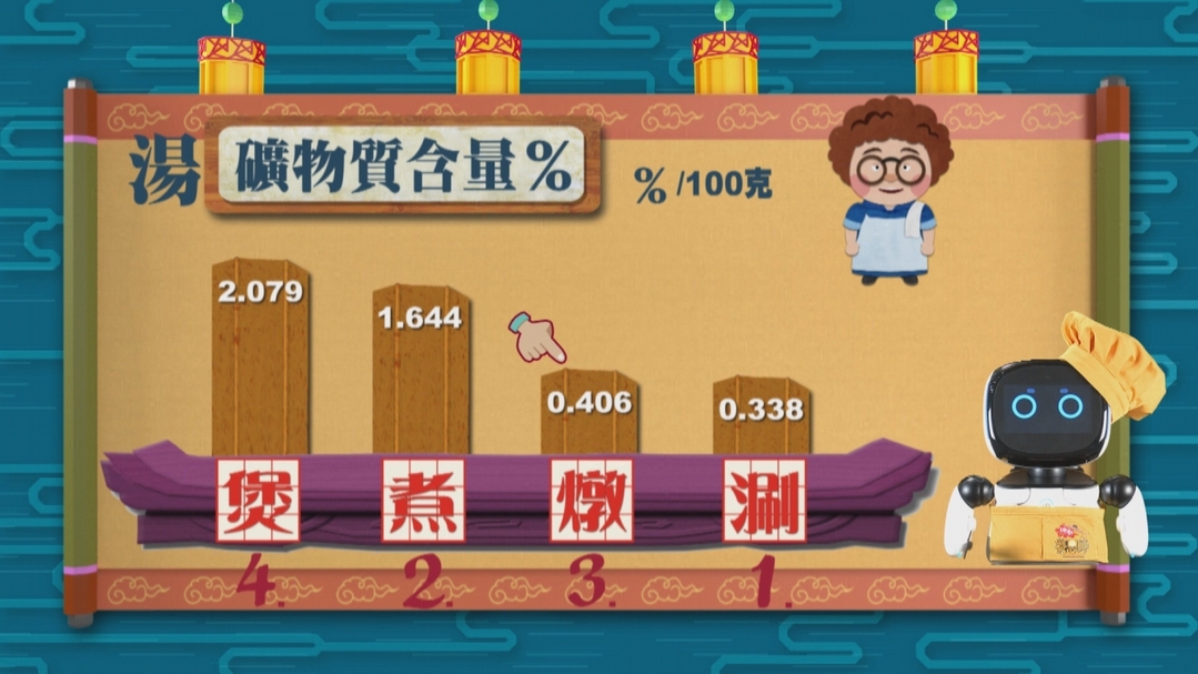 首先,「燉」的時間明明就比「煲」的時間久,為什麼湯顯得很清澈,煲湯卻很濁呢?《神廚賽恩師》請了海洋大學食品科學系來做一些測試,包括營養成分濃度、湯裡面的總礦物質含量,燉的排行只比涮好而已。涮的時間一般都非常短,導致溶出的物質很少;燉的話,因為一直維持在攝氏100度,加上隔水加熱的方式讓鍋底沒有高熱,因此鍋中牛肉的營養不會流失太多,又能燉爛,所以湯就還是很清澈囉!