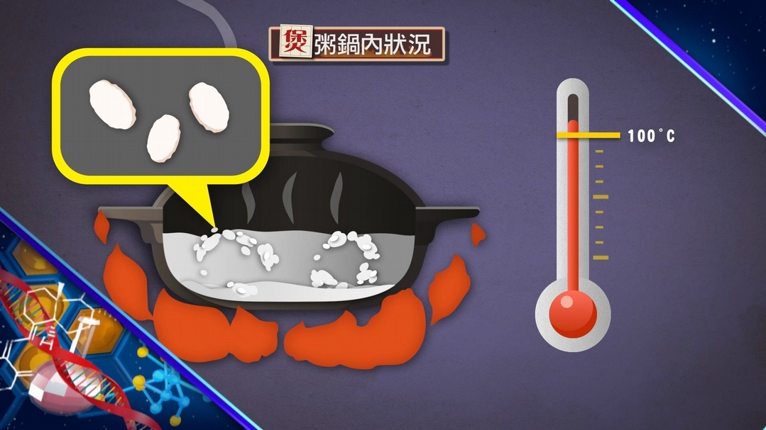 至於「狀元及第粥」,不同於通常用熟飯加水煮的台式鹹粥,廣東粥是用「生米」煲出來的,最重要的步驟就是用明火去煮粥,但為什麼用大火滾,不會讓米飯燒焦黏底呢?因為大火可以讓米粒持續翻滾,不會掉落到底部焦掉,而且它可以讓米粒在高溫下迅速膨脹、破壞結構,加快它軟爛的速度,等米粒爆開後,就可以轉小火繼續慢慢煲2個小時。