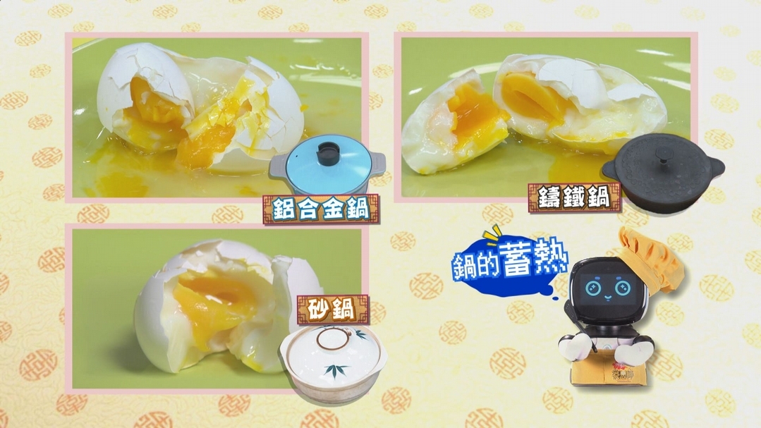說完了「煲」的厲害之處,大家有沒有發現煲的食物常常使用「砂鍋」當容器裝呢?《神廚賽恩師》拿砂鍋、鋁合金湯鍋,還有鑄鐵鍋做比較,水煮沸之後放入生蛋,蓋鍋悶熟的程度以砂鍋表現最好。其實陶土混合砂粒做成的砂鍋,本身的材質特性就是耐熱又保溫,再加上陶土的導熱係數小,鍋中熱量不易散出、蓄熱力佳,受熱均勻又耐長時間烹煮,正是煲的最佳容器喔!
