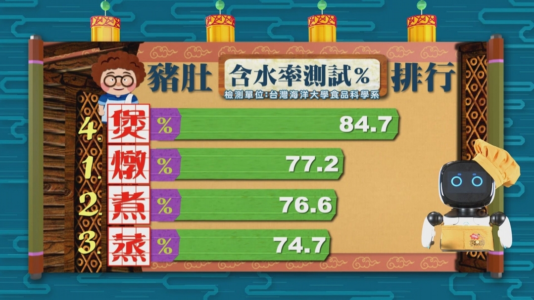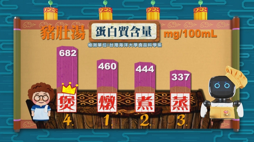 到底「煲」這個做法會讓食材多美味呢?關於用燉、煮、蒸、煲四種不同料理方式做出來的酸菜豬肚湯,《神廚賽恩師》委託海洋大學食品科學系做檢測,發現蒸出來的豬肚硬度是最高的,至於煲湯當中的豬肚不僅是最軟的,含水量也最高。