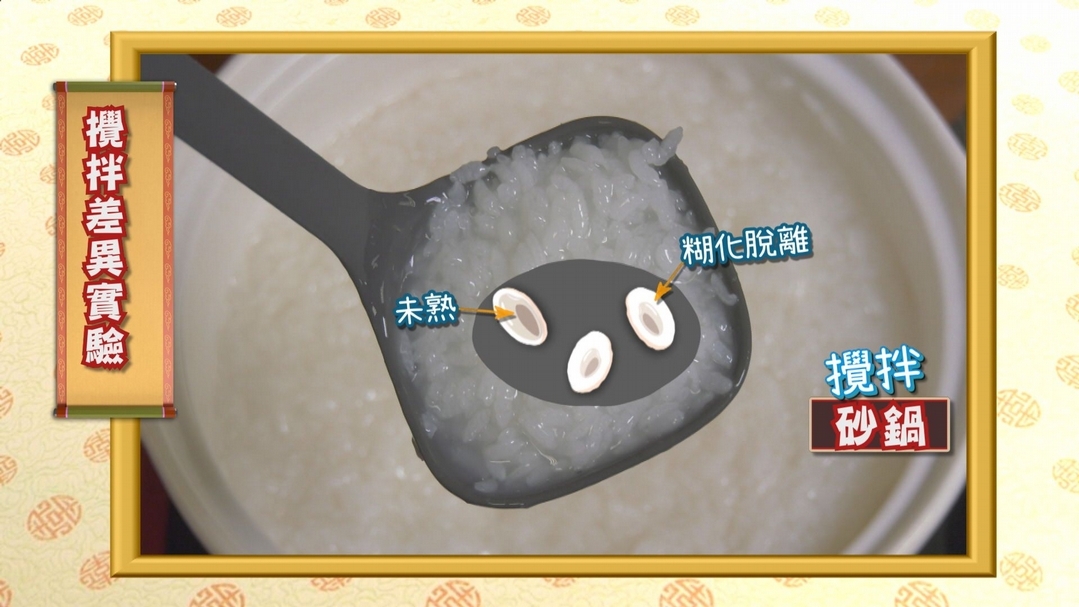 但在煲2小時的過程中,難道不用一直攪拌嗎?答案是不需要!《神廚賽恩師》做了砂鍋和金屬鍋攪拌差異實驗,其中金屬鍋因為底部溫度很高,米粒的黏度增加,熱對流就不好進行,因此不攪拌鍋底就容易焦掉;但用砂鍋來煲粥,攪拌反而會讓米粒外部的澱粉分子糊化,提早離開米粒,讓水的黏度變大,但米粒中心卻還是硬的,這樣就煲不出細滑綿密的粥了~