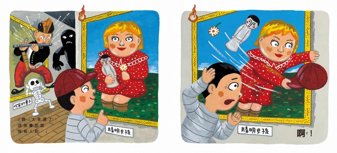 小男孩的帽子突然的就被畫作裡精明的小女孩給拿走了!開始一段美術館的追逐戰。《妖怪美術館》內頁(圖片來源:青林國際出版官網)
