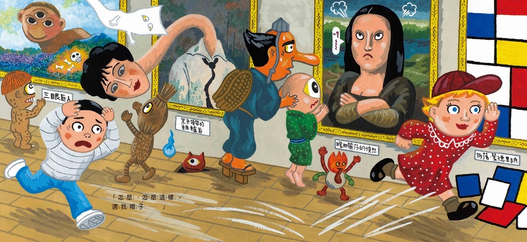 接著,小男孩的帽子突然的就被畫作裡精明的小女孩給拿走了!開始一段美術館的追逐戰,沿途饒富各式事件發生的趣味就盡在圖像中,每個畫面角落都能發現樂趣,而這場追逐戰最後則由故事裡的「百目妖怪」畫家為情節「畫」下圓滿的結束。
