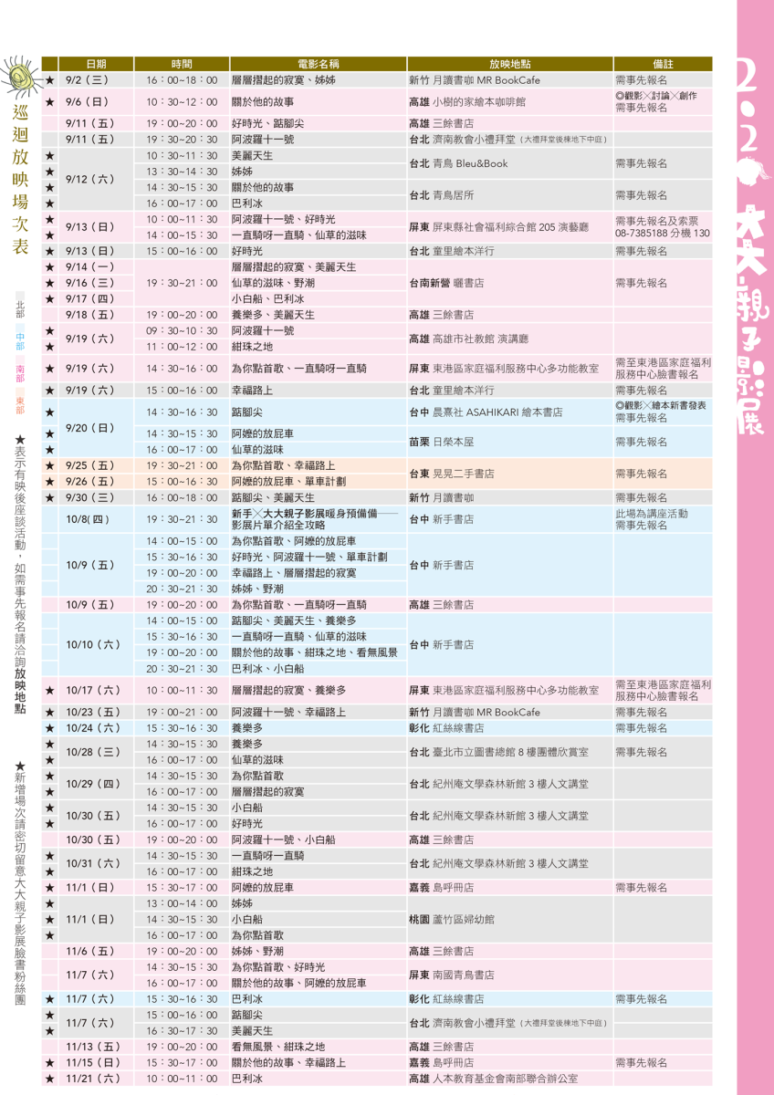 2020「大大親子影展」於9月至11月期間,在台北、新北、桃園、新竹、苗栗、台中、彰化、嘉義、台南、高雄、屏東和台東等12個縣市巡迴放映,超過30個社教、兒童、書店或人文空間,讓大大的親子共學與共享精神,深入台灣社區與民間,巡迴70場次場場皆安排映後座談與分享時間,今年更特別與「大腳小腳」親子共學團、繪本教室等團體合作,希望結合電影與繪本的共讀形式,讓父母與孩子進行對話,深植「兒少人權」的親子價值。