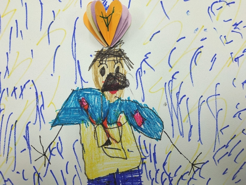 這學期帶了兩個學校的課後社團,開心能探詢兒童畫背後的原因機會變多了,有個一年級男生的創作中頻頻出現打雷場景,好奇之下聊起,才知他們家人的房子曾因為雷擊而損毀過,難怪打雷在他心目中留下深刻印象,畫面從一開始主角開開心心的,到後來開始閃電打雷,穿上雨衣後表情也略有變化。有故事及想法的作品才更耐人尋味、值得再三探究。