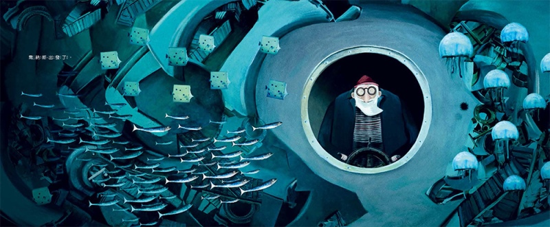 封面的畫面中央,一個身著紅白條紋的小人似乎正往下墜,左側游來一群帶著好奇的魚,喬納斯為什麼會落海?他的心情如何?他跟大海發生了的什麼故事?多吸引人的封面啊!
