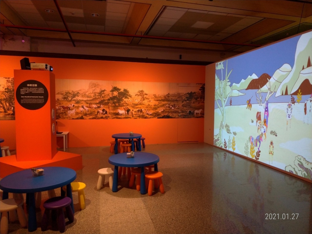 第四區為「故事:錯視奇珍」,播放本院製作之高解析畫質影片,與觀眾一同解密古青銅器、玉器匠心獨具之設計巧思;第五區為「色彩:藝遊空間」,設置「神奇百駿」大型數位互動投影牆及教育學習區,大小朋友可親身創作彩繪出屬於自己的駿馬,與古代畫家一同共創藝術;第六區為「美學再想像:故宮文創」,結合上述五個賞析重點,激發觀眾創意思考,仔細品味古文物所蘊藏的現代時尚美學。