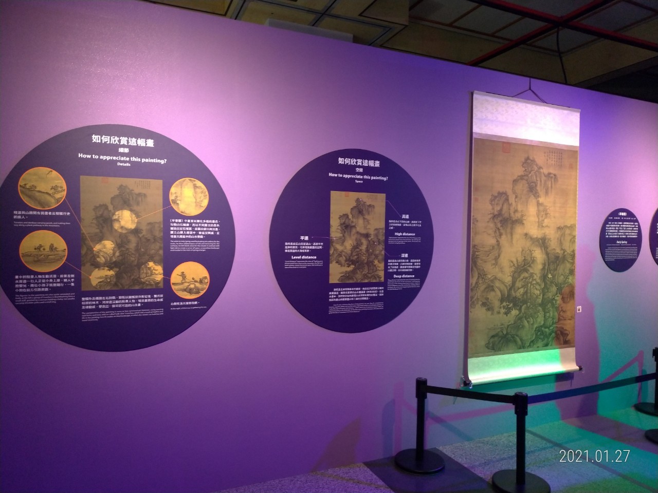 第二區為「構成:山水新境」,展示文物〈早春圖〉、〈谿山行旅圖〉複製作品,設置「走入畫中」體感互動裝置及示意教具,促進觀眾對文物構圖佈局的多感官認知與情意體驗。
