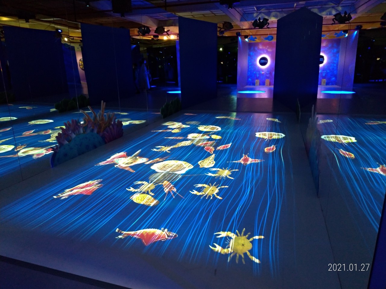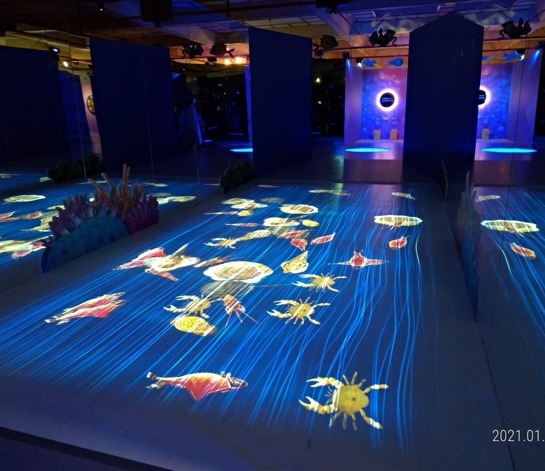 走入展場後映入眼簾之第一區為本次展覽亮點—「主題:水中藝想」從海洋去想像,展陳故宮典藏〈海錯圖〉複製作品及〈海怪圖記〉圖像,對照真實生物圖像還原,並運用文物中的海洋生物為素材,打造十八公尺長的奇幻水族世界,虛實整合,與觀眾一起探索古代及現代海洋,期待透過數位展演開啟觀眾觀看經典之作新的姿態。