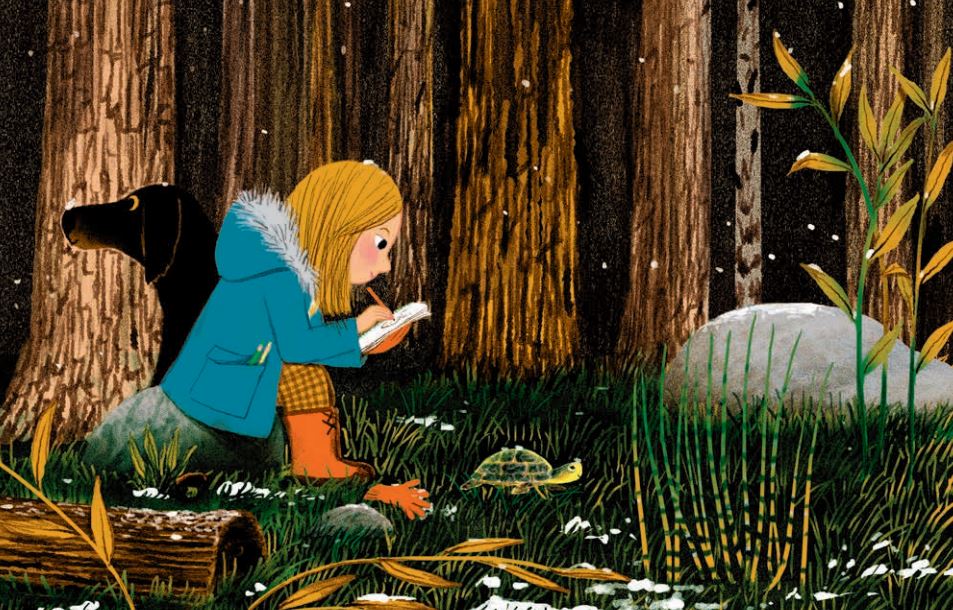 與文字相應的景色變化,同樣精彩地呈現於畫面中。小女孩在森林裡一處一處移動遊走著,在巨木下、樹叢間、草原上、溪流旁,天空的大幕則由傍晚時分微微的粉橘,漸漸深沈寂靜,埋入墨色。我們在傾躺的草原中看見風的方向,在小女孩拉起大衣上的帽子時感受氣溫驟降。女孩進屋前,雪花片片落下,夜已然靠近,也為這趟散步小旅程畫下靜歇的符號。畫家馬克‧布塔方總是帶給我們吟詩般的視覺饗宴。