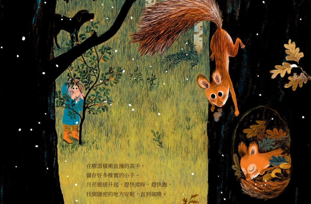 在這部作品裡,小女孩召喚了動物朋友們一起進行了向夜晚道別的儀式,一頁一頁翻著,我們會與大爪子、絨絨鼻、硬硬殼、亮亮鱗片、繽紛翅膀擦肩而過,多數的跨頁中,一側是動物們在森林裡活動的景象、一側是牠們在巢穴裡休憩的安穩。那份回到自己小窩的放鬆心情,凝煉了心靈的安定。讓我們在說晚安時,收斂白天的精力,安放夜晚的寧靜。