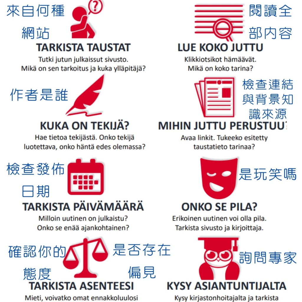 平時在課堂上若需使用網路查詢資料,老師一定會要求學生進行事實的核查,例如:資訊來自何種網站?目的是什麼?作者是誰?背景知識來源為何?有證據嗎?或者只是某人的意見?而且引用資料必須有三或四個不同可靠的來源,而非使用維基百科,這些從平時累積的基本功,正是芬蘭媒體素養教育成功的根基。
