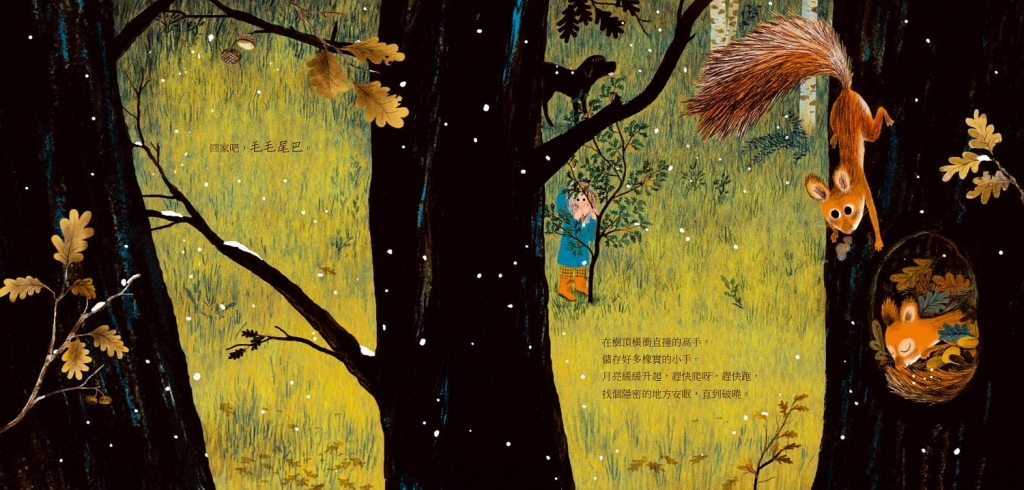 馬克‧布塔方的圖像世界向來溫暖又綺麗。不過,十分擅長亮彩搭配的他,在這本書裡以溫醇的大地色系,烘托既靜謐又熱鬧的森林準備休憩的樣貌。你可以在書中多幅跨頁裡看見左右頁面動態與靜態的對比,這樣的大地與世界給人生生不息的感受,因為夜晚之後,白天又將來到,生命的循環亦復如此。布塔方在畫面的轉折上加入開始飄雪的情節,也使安靜的敘事融入動態場景,使圖像加倍生動呢。