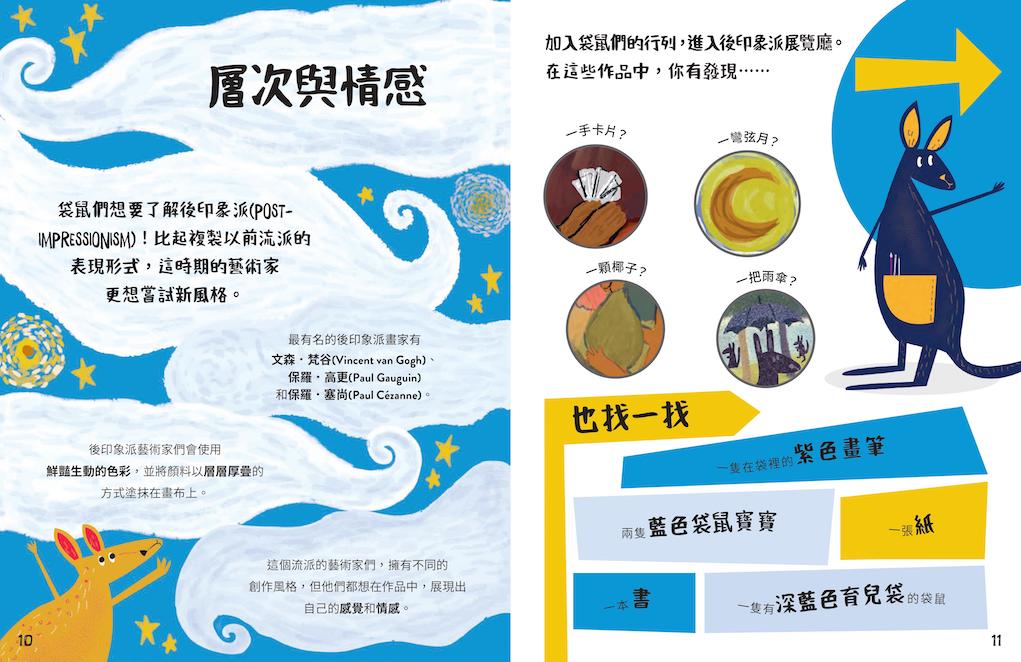 至於書中所介紹現代藝術中主要的九個藝術流派,如何以孩子的視角來呈現,作者以自己內涵的藝術修為選擇了描繪各流派的關鍵字彙,不單類比分類上的索引、提示,而能讓親子在接近藝術史的同時也化繁為簡集中注意力,抓住該流派的精神,如:捕捉「光線變化」與掌握「某個時刻」的印象派;靈感來自「夢境」,畫出腦中「想像」的超現實主義…。