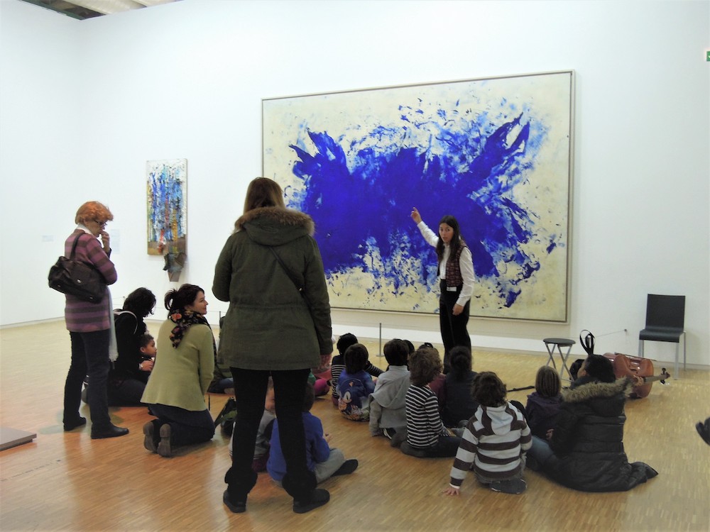 直到現在我還沒法忘記這個畫面:那些抽象的藍色系,彷彿隨著不同節拍的海浪由天際蔓延開來…不僅牢牢地抓住了孩子的眼神,也拍打在我心裡…不知過了多久琴聲停止,在一片靜默後,老師才起身說話,接著孩子們以自己獨有的純真,踴躍也認真地跟老師分享他們的想法。(謝謝身旁一個好心的法國人用英文告訴我孩子的回應,印象最深的是有個孩子說畫裡有一群快樂的魚朋友們在開party )