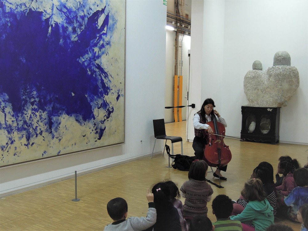 只見孩子們聚集在畫作前,在大人的引導下就地而坐,不一會兒領隊老師不知從哪找來的大提琴,坐在前面的凳子上隨即拉奏起來。