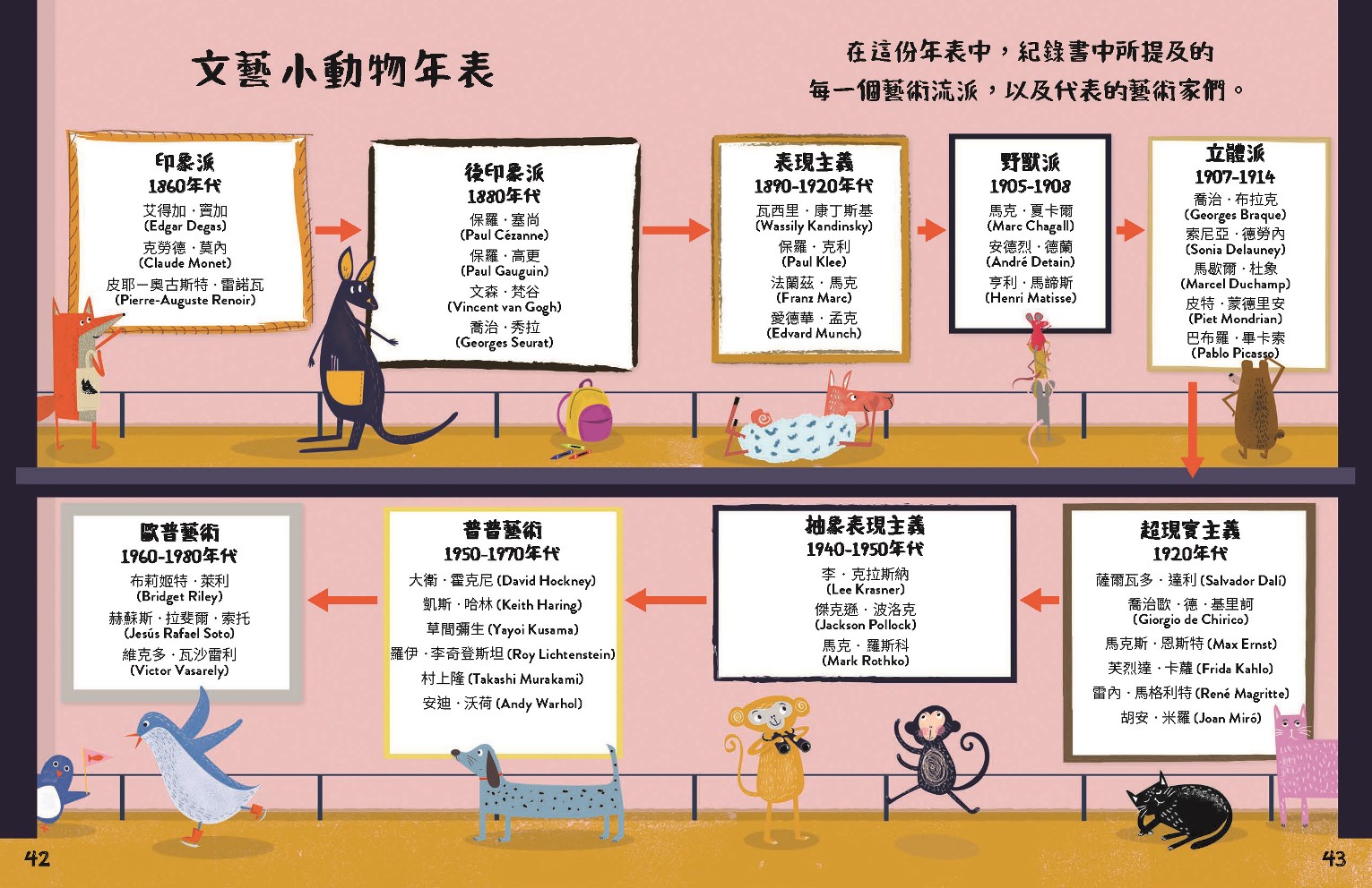 年代表及詞彙表:在書的最後,整理出簡潔的時間軸及重點的名詞解釋,在參觀完不同流派的展覽廳後,能快速的再次總覽。