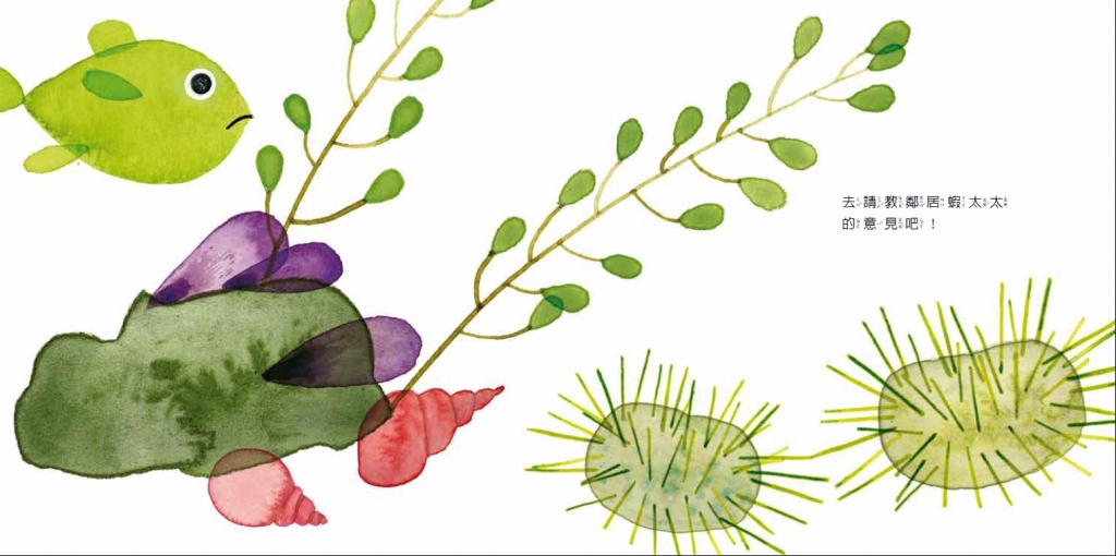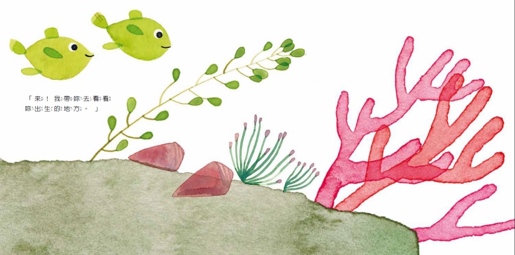 翻開「封面」,看到綠色的魚和魚卵,應該不難猜想,這隻魚就是魚媽媽,正溫柔的看著她的寶寶。若將「封面」和「封底」同時攤開,還可以看到海裡的其他魚群和海草,於是我們可以猜測,故事發生在海裡。