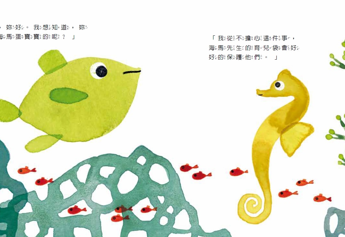 這是一本讓我們更了解海洋生物的繪本,跟著魚媽媽,我們認識了海洋生物保護寶寶的方法;又透過結構相似、不斷重複的語句,我們在不知不覺中就吸收了這些海洋知識。在圖像表現上,繪本中的海中生物都以單一顏色呈現,加上大量的留白,讀來有一股清爽感,彷彿可以感受海的清澈。