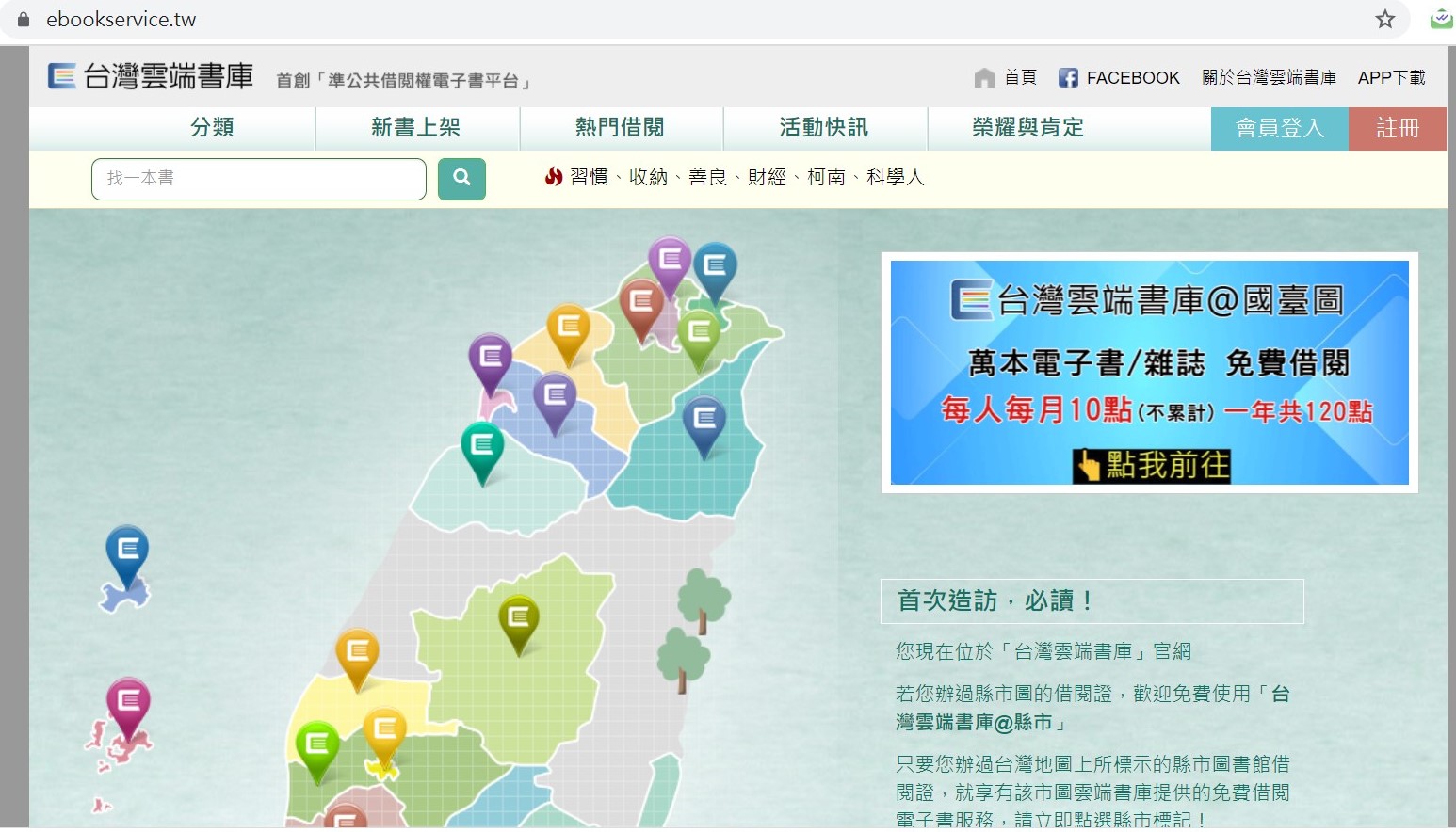 申辦資格:只要辦過首頁台灣地圖所標示的縣市圖書館借閱證,就可使用該市圖雲端書庫提供的免費電子書借閱服務持有「台灣雲端書庫」合作的公共圖書館借書證登入後即可借閱。