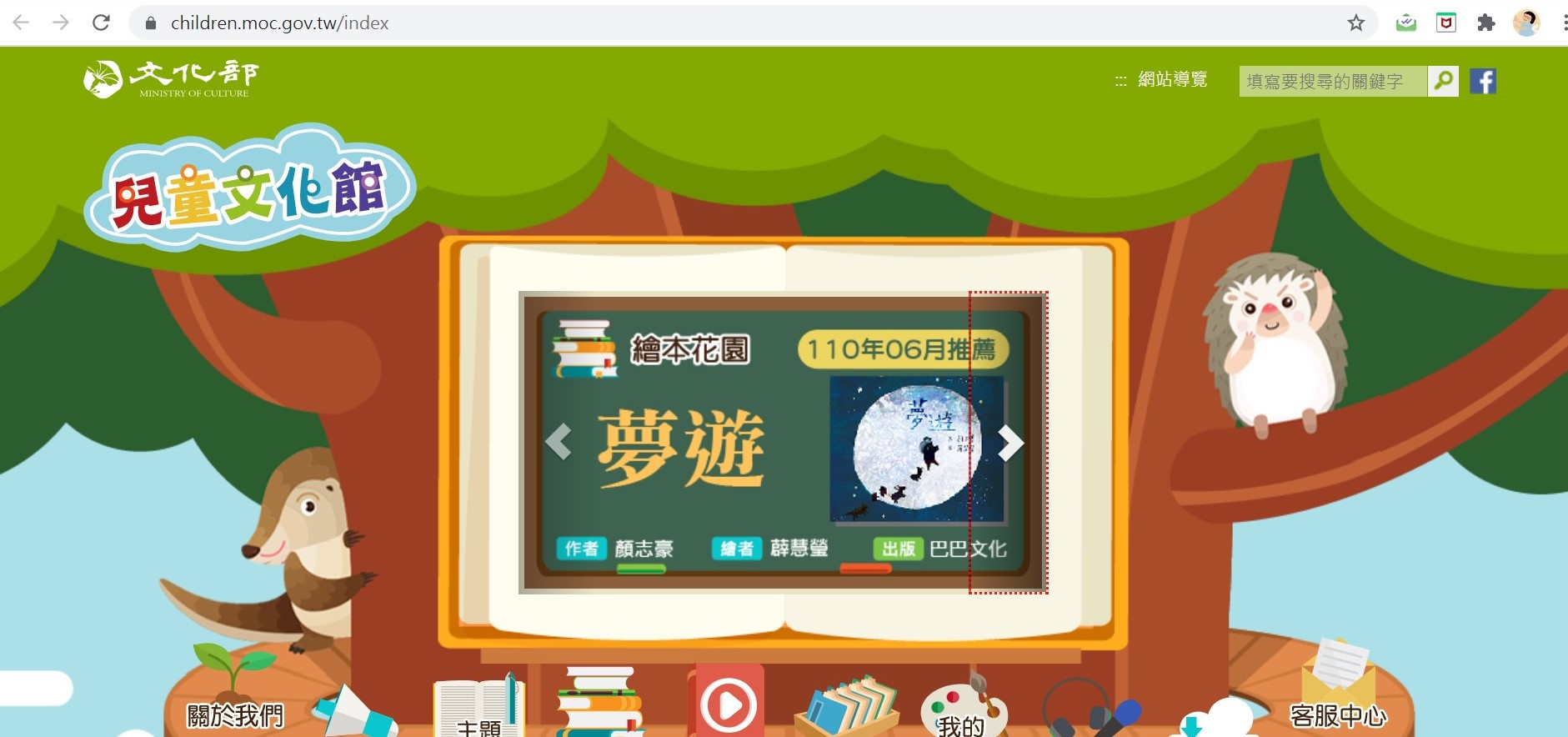 「兒童文化館」網站自1999年建置,以提升兒童閱讀興趣為目標,專屬兒童線上閱讀的園地,經由長期的線上繪本閱讀素材的累積,以及更具體地將文化主題相關的閱讀內容,製作成活潑又有互動性的動畫播放與遊戲,讓兒童能以輕鬆、活潑的方式來進行閱讀,進而培養閱讀習慣。因此,特別著重在創意與互動之表現上,經由創意與互動性的設計,讓兒童親近閱讀、喜愛閱讀、擁有對閱讀的熱情!