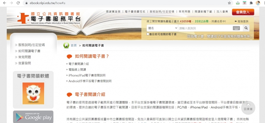 持有國立公共資訊圖書館或臺中市立圖書館借閱證,免加入會員即可直接以國立公共資訊圖書館借閱證帳密登入借閱電子書; 持其他縣市任一公共圖書館借閱證,第一次使用本平台需先加入會員。 會員登入後,每位讀者同時可借閱8冊,每本電子書借期14日,到期後系統自動歸還,如無人預約,得續借1次,期限自續借當日起14天;另可預約4冊,預約保留天數7日。
