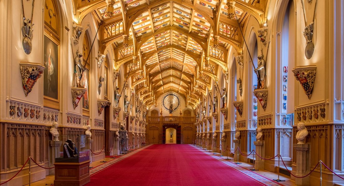 當我們走進第一個長形寬闊的展廳時,抬頭向上看,您會看到五顏六色的盾牌型徽章,這些徽章上有著不同的幾何圖形和圖案,它們有的造型簡單,有的精美複雜,您或許會看到一個有著白色叉叉的紅色徽章,或是一個畫著藍色獅子的金色徽章等等。這些用來裝飾天花板的徽章,是14世紀以來由英國君主親自授予騎士身份的嘉德勳章,據說這些象徵高貴與榮譽的徽章只會授予英國皇室成員,以及少數的外國君王。其中,日本的昭和天皇就曾獲得伊莉莎白二世女王頒發的嘉德勳章。看到這麼多只有王族才能獲得的徽章,以及兩側仿彿保護王族的銀色士兵盔甲,您猜到這個展廳的功能了嗎?其實,這裡是女王招待外國王室、總統和首相的國宴廳,又稱為聖喬治廳,美國總統雷根,以及歐洲各國國王,都曾經是聖喬治廳的座上賓。當您在參觀時,不妨發揮想像力,想像中央有一個擺放著精緻餐具和新鮮花束的百人長桌,各國重要人物和女王同坐在長桌旁享用著美味的餐點,場面還真是相當熱鬧啊!