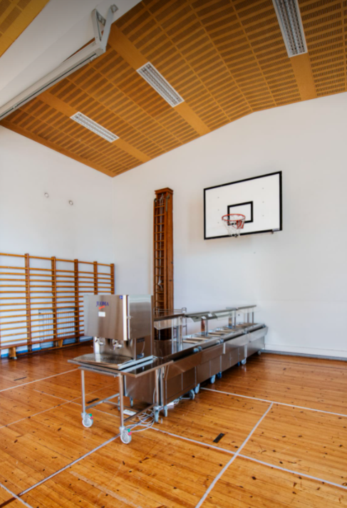 5.吃飯時間是各年級錯開,把體育場也臨時改成用餐區,因此各班有自己的空間與距離。
