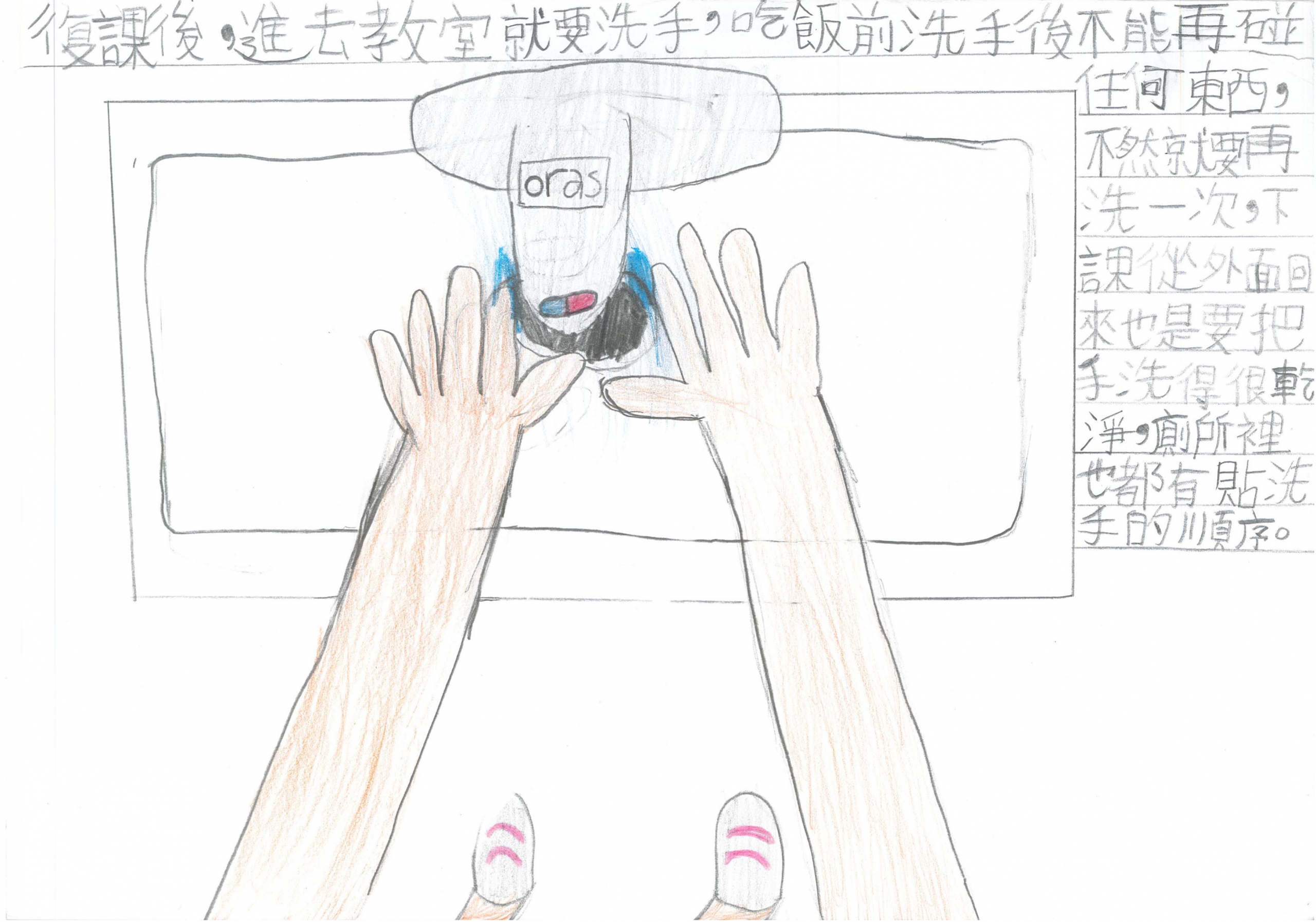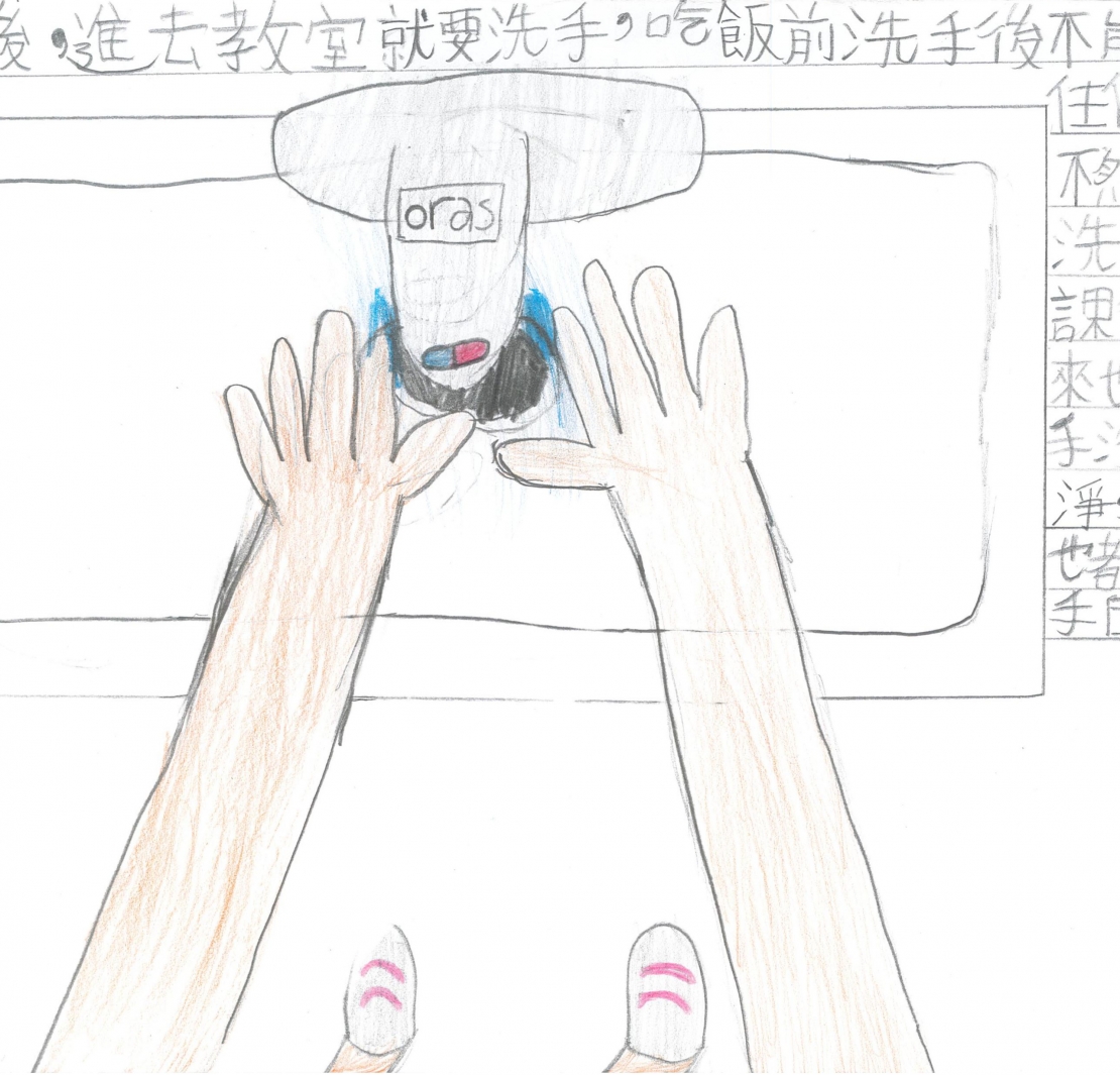 復課後,進去教室就要洗手,吃飯前洗手後不能再碰任何東西,不然就要再洗一次,下課從外面回來也是要把手洗得很乾淨,廁所裡也都有貼洗手的順序。