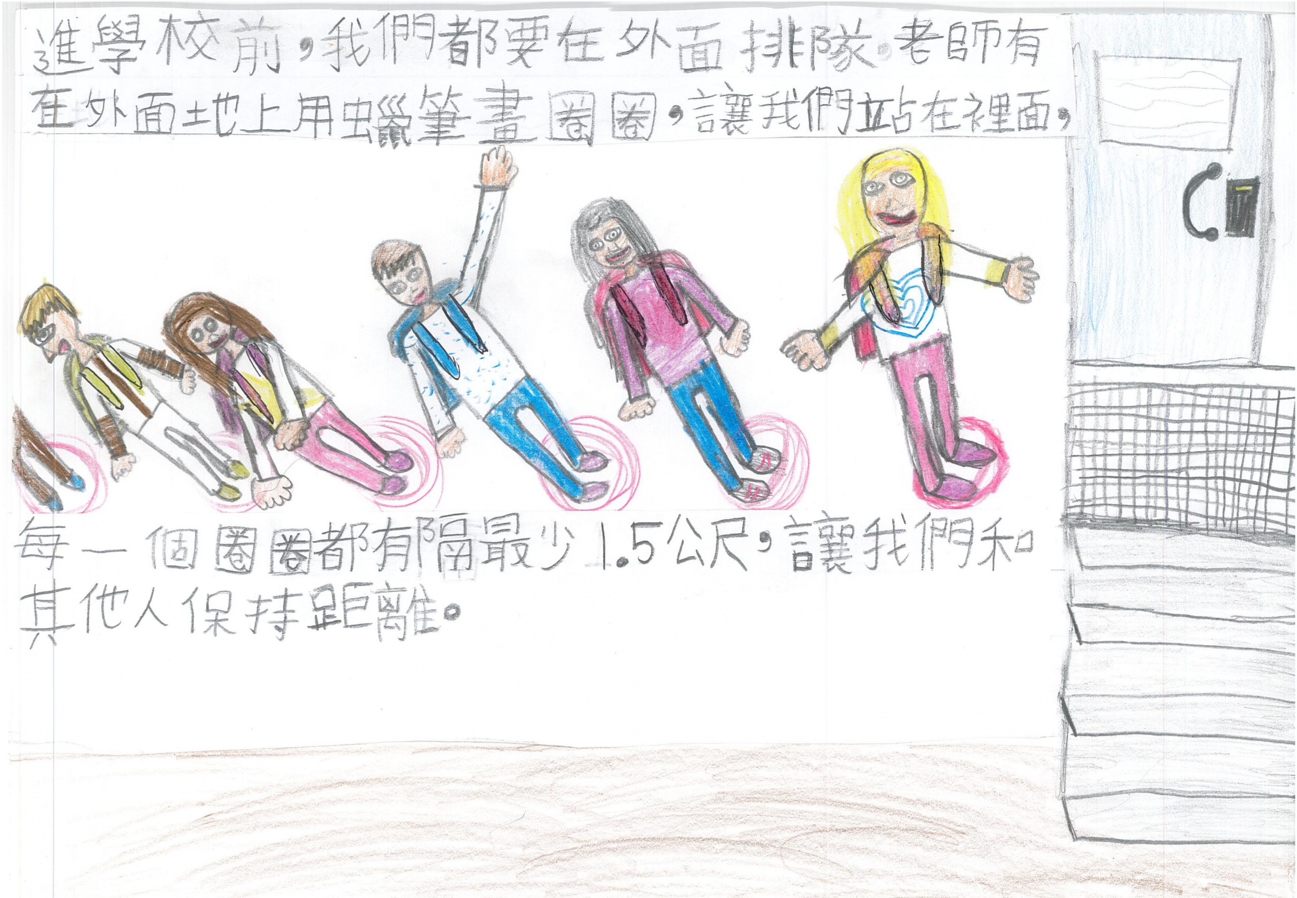 進學校前,我們都要在外面排隊,老師有在外面的地上用蠟筆畫圈圈,讓我們站在裡面,每一個圈圈都有隔最少1.5公尺,讓我們和其他人保持距離。