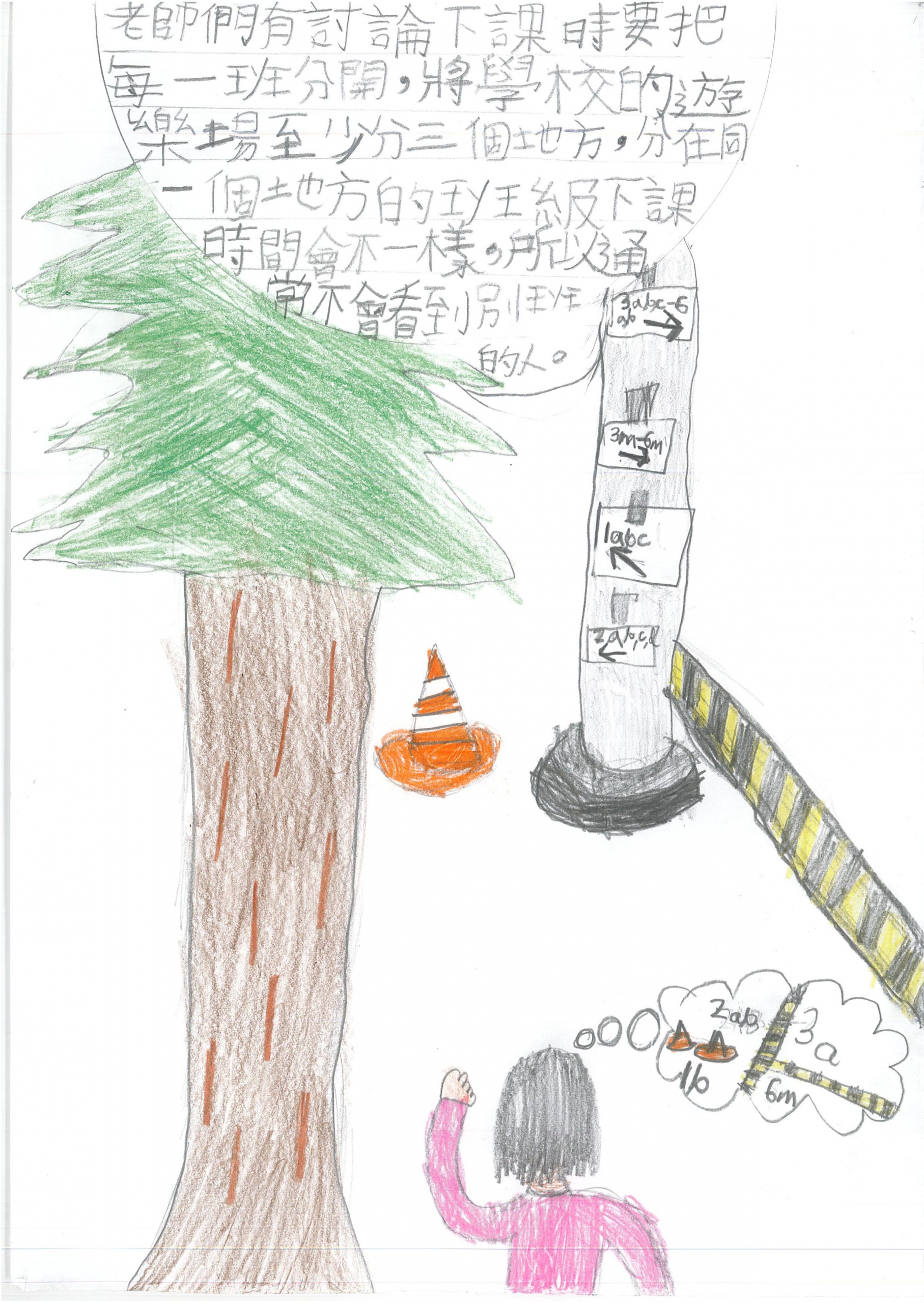 老師們有討論下課時要把每一班分開,將學校的遊樂場至少分三個地方,分在同一個地方的班級下課時間會不一樣,所以通常不會看到別班的人。