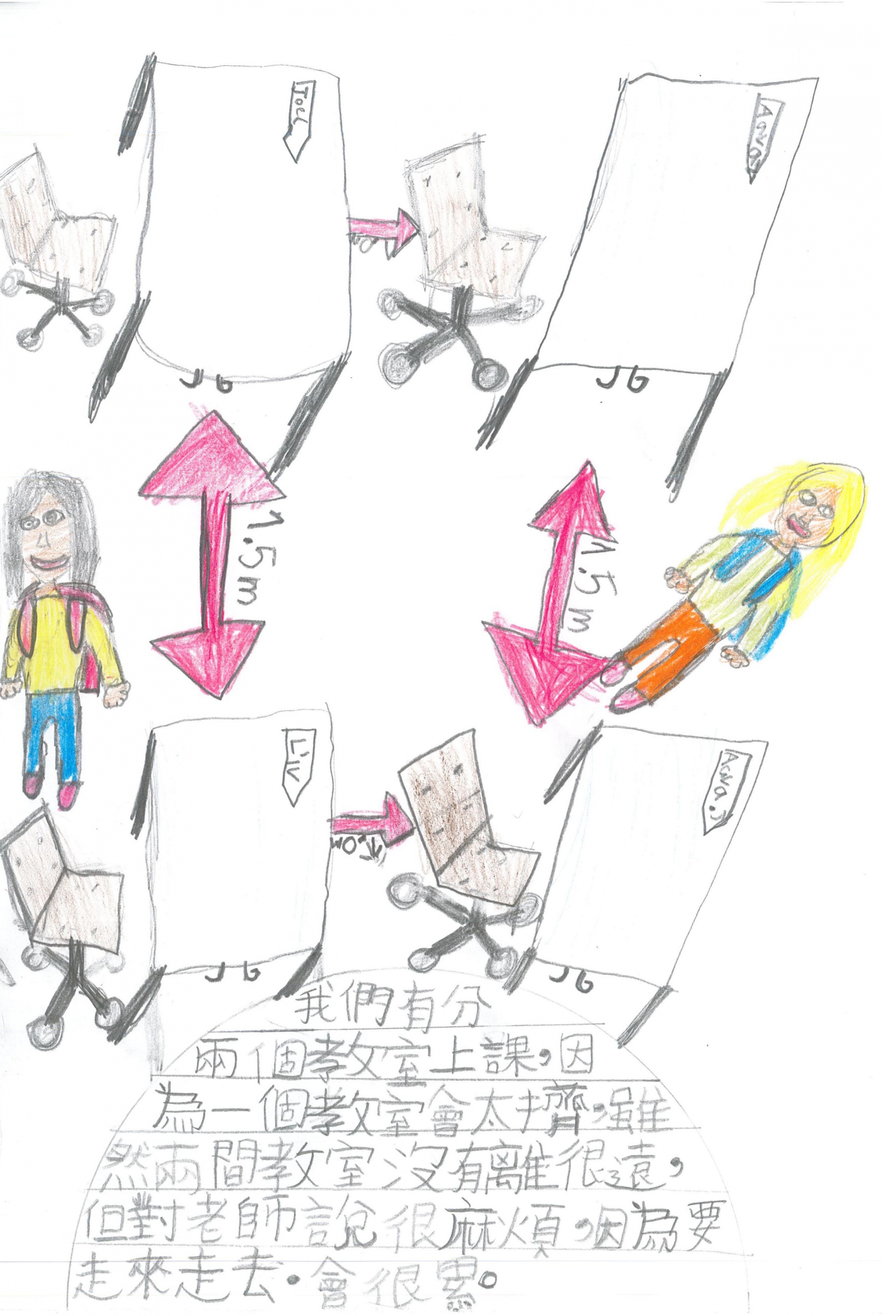 我們有分兩個教室上課,因為一個教室會太擠,雖然兩間教室沒有離很遠,但對老師說很麻煩,因為要走來走去,會很累。