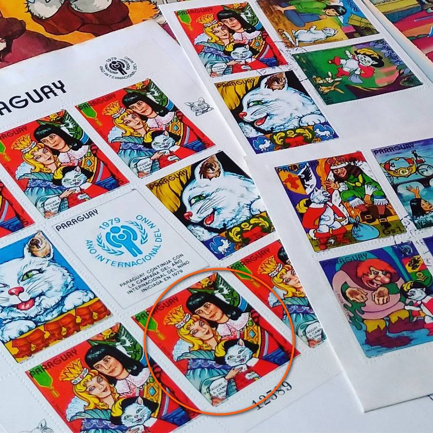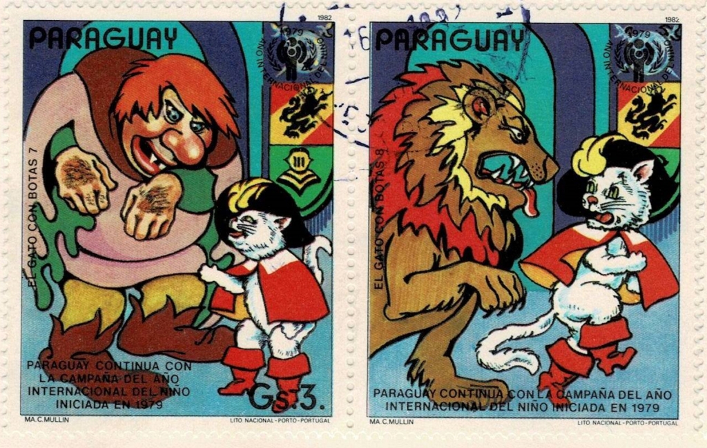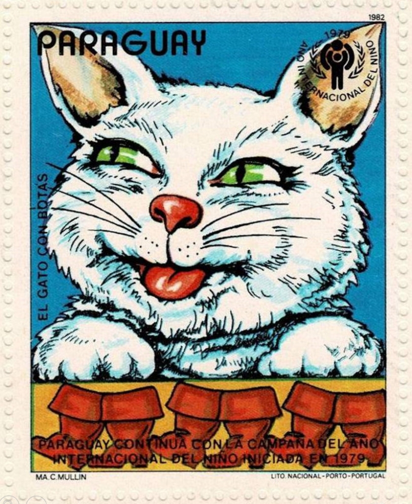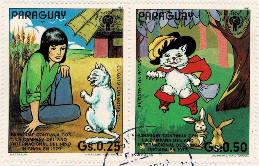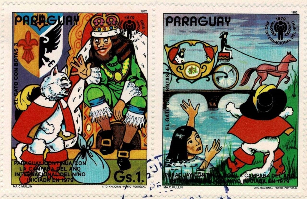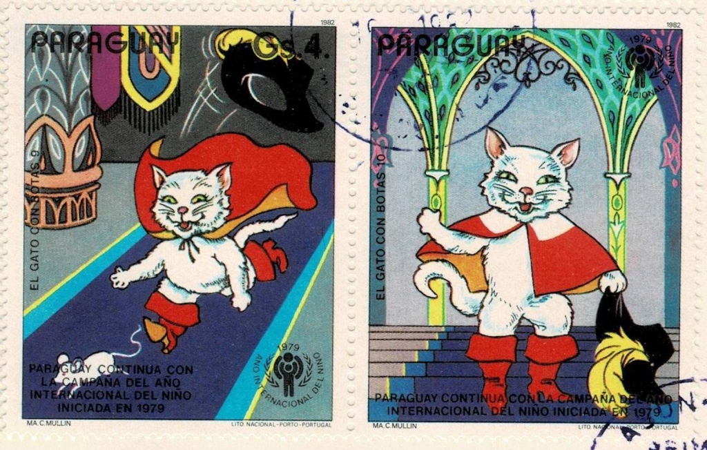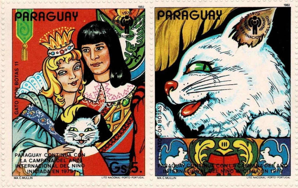 巴拉圭1982年4月16日發行的「穿靴子的貓」童話郵票,無論畫風、技法、色調都精準描繪了故事情節,令人愛不釋手,發行至今已近四十年,魅力依舊不減。而這套郵票發行最主要目的,是配合聯合國訂定1979年為「國際兒童年」(提醒世界各國關注兒童權益與兒童福利),於是巴拉圭在1979年發行過「小紅帽」、「灰姑娘」、「白雪公主」等兒童喜愛的童話主題郵票後,並持續在1982年發行貝洛童話郵票「穿靴子的貓」,因此郵票右上角或右下角皆有「國際兒童年」標誌,象徵著小朋友迎向光明。