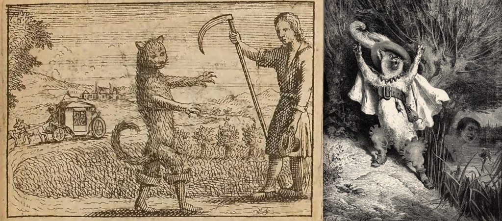 童話故事的插圖,是插畫家各自詮釋心中主角形象競相展現插畫功力的競技場,亦值得讀者細細欣賞插畫者的創意與視覺美感。在1697年法國《貝洛童話集》初版書內插圖,貓咪僅穿著長靴(圖片9左),巴拉圭發行的郵票中,貓咪除了靴子,並多了紅色披風、黑色絨帽。十九世紀法國知名版畫插畫家古斯塔夫.多雷的雕刻版畫,所繪製的貓不僅有靴子、羽毛帽、披肩,還有腰帶。(腰帶上還吊著兩隻老鼠!)其高貴華麗的夢幻之感、精緻的細節技法、具藝術性的光影表現等,都無疑是讀者眼中最經典的插圖(圖片9右)。