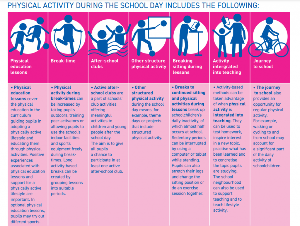 增加上學日的運動時間需要改變學校空間、建築、校規、價值觀和態度。校方要思考的是:什麼樣的學校可以鼓勵孩子們積極參加體育活動?活動應該如何組織?如何支持和管理學校文化的變化?