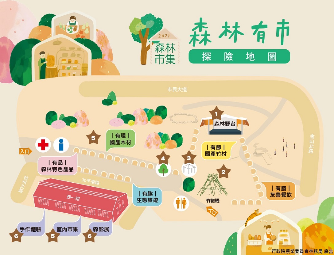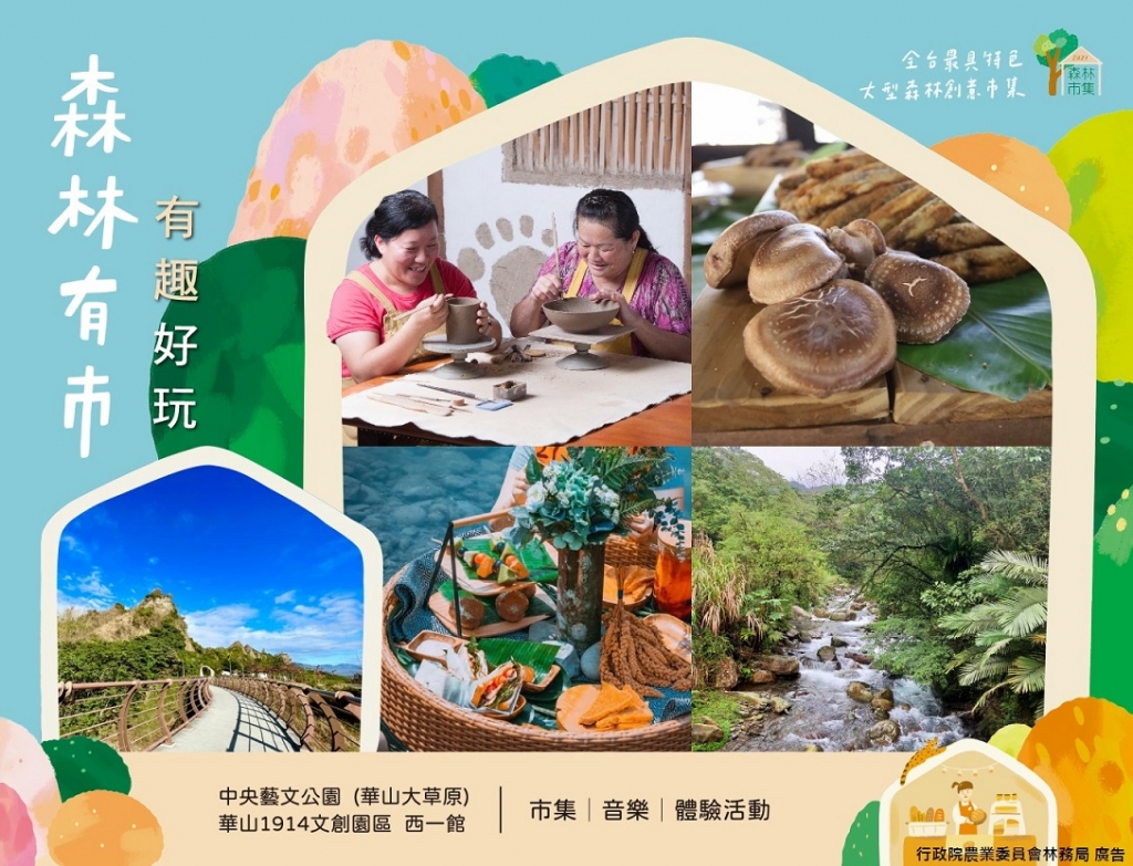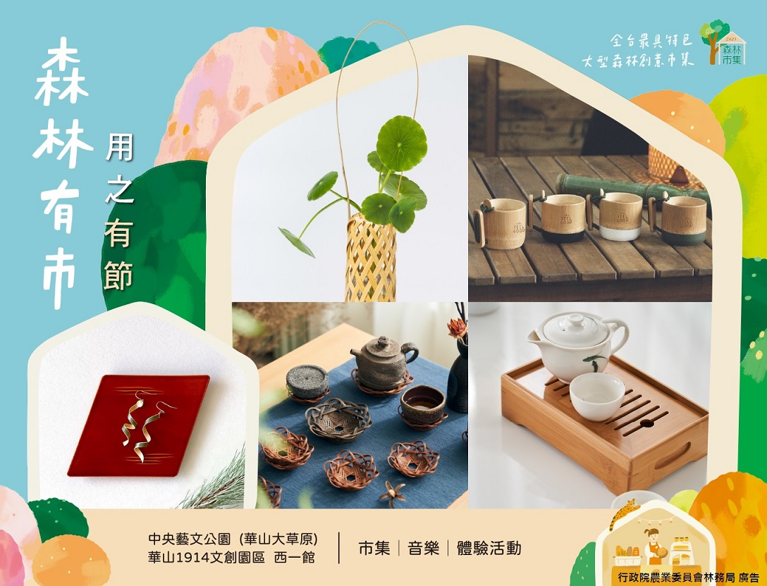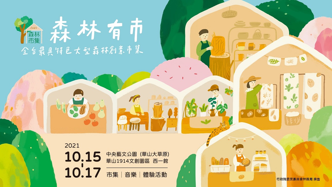 以推廣生態環境為初衷,林務局每年舉辦的「森林市集」已經邁入第五屆,2021年預計自10月15日至10月17日連續三天,於華山1914文創園區西一館及中央藝文公園(華山大草原)舉行。